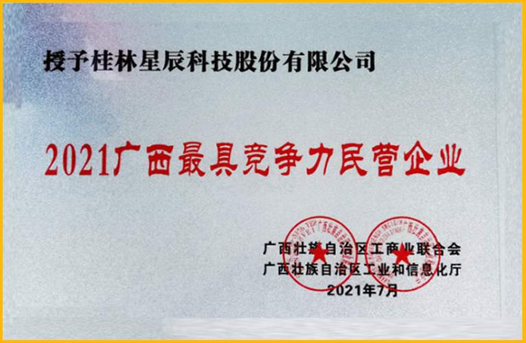 2021年7月23日上午,由廣西壯族自治區(qū)工商聯(lián)、百色市人民政府主辦,廣西自治區(qū)科技廳、自治區(qū)工業(yè)和信息化廳、廣西稅務(wù)局、建設(shè)銀行廣西區(qū)分行協(xié)辦的2021廣西民營(yíng)企業(yè)100強(qiáng)發(fā)布會(huì)在百色市舉行,星辰科技榮獲“2021廣西最具競(jìng)爭(zhēng)力民營(yíng)企業(yè)”!
