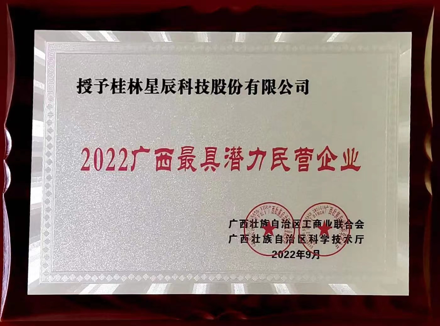 2022年9月6日,“2022廣西民營企業(yè)100強”發(fā)布會在柳州召開。廣西工商聯(lián)根據(jù)企業(yè)在國內(nèi)市場占有率、行業(yè)排名和擁有核心技術等領域上的潛在實力,評選出了“2022廣西最具潛力民營企業(yè)”“2022廣西最具競爭力民營企業(yè)”等榜單。星辰科技在眾多企業(yè)中脫穎而出,成功評選為“2022年廣西最具潛力民營企業(yè)”。