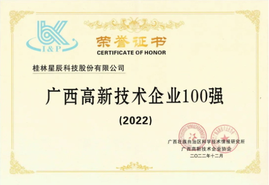 近日,廣西科技廳發(fā)布了2022年廣西高新技術(shù)企業(yè)百?gòu)?qiáng)榜單,桂林星辰科技股份有限公司成功入選“廣西高新技術(shù)企業(yè)100強(qiáng)”。